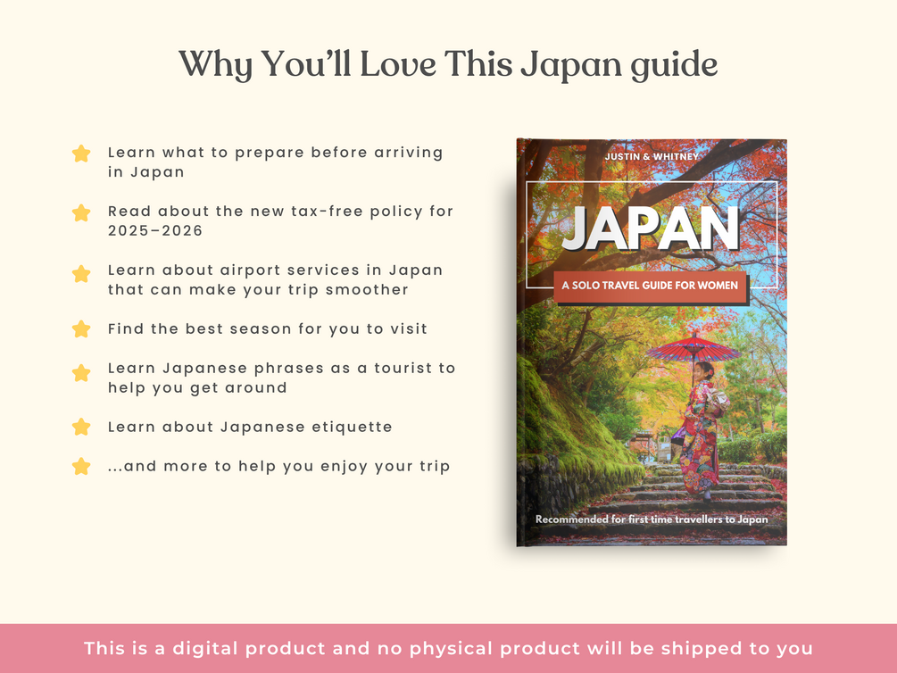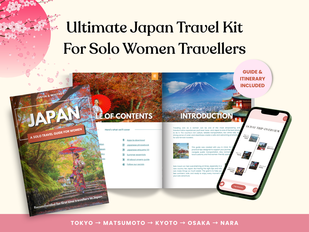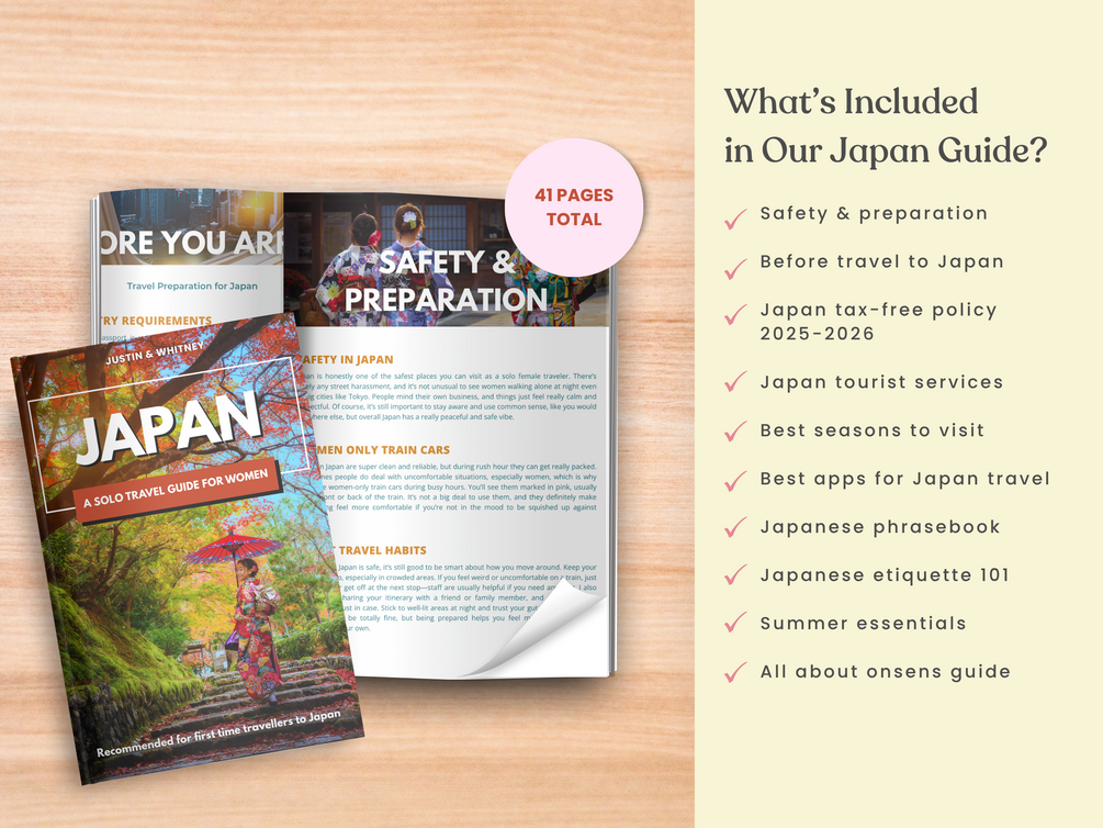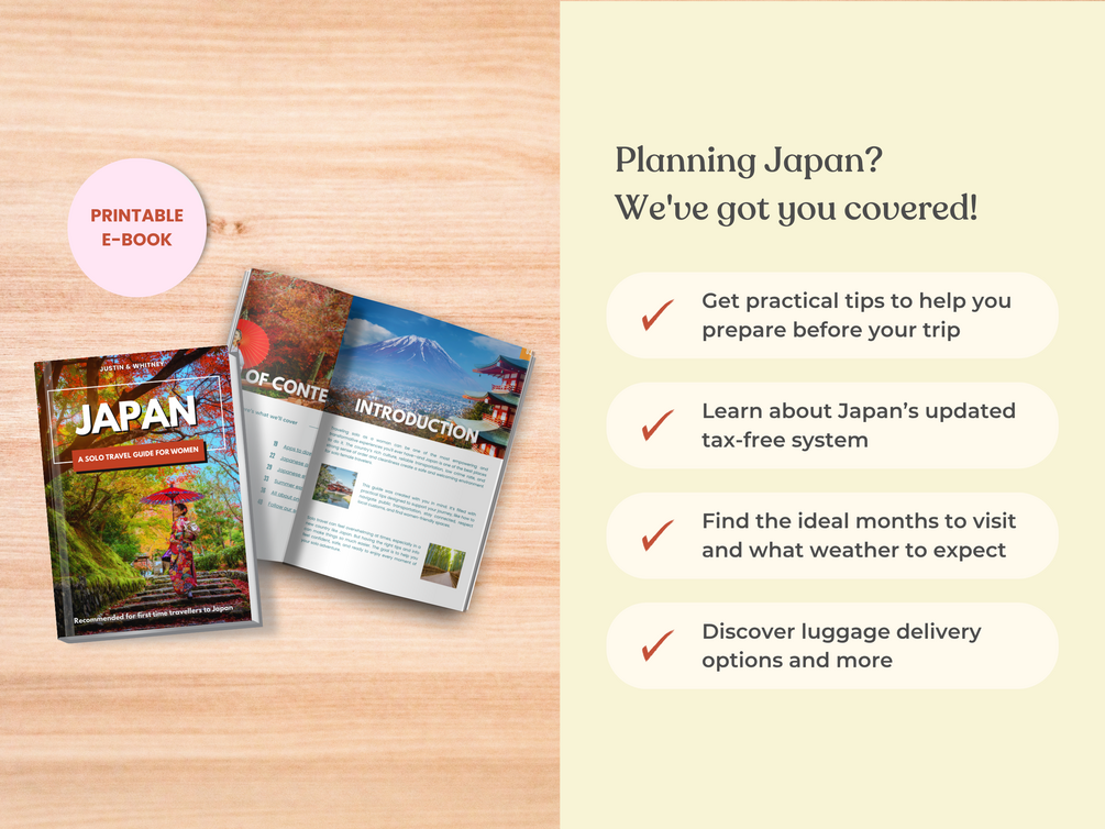 Planning a solo trip to Japan for the first time? Our digital e-book guide is made for adventurous solo women travellers like you. It’s filled with helpful tips to make your trip feel safe, easy, and empowering. You'll learn about Japanese etiquette & phrases, find women-only stays, understand onsen rules (even if you have tattoos), and stay connected with the right apps.