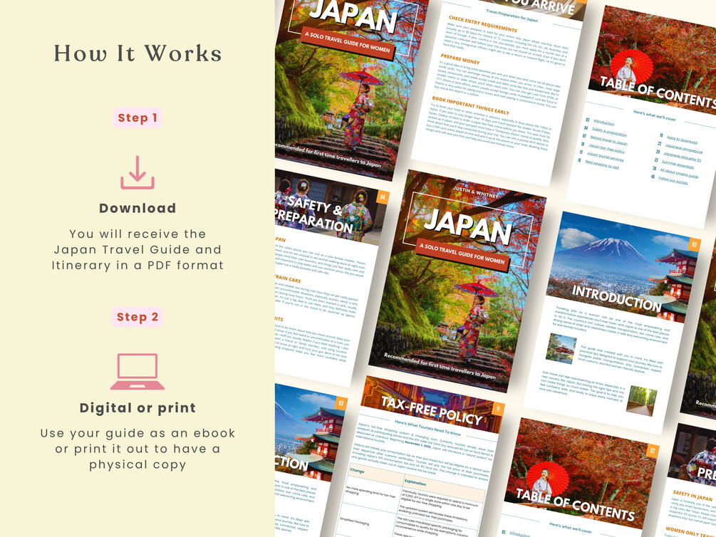 You will receive one Japan travel guide and one 14-day Japan itinerary both in PDF format